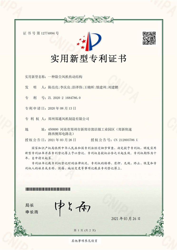 一種除塵風(fēng)機傳動結(jié)構(gòu)實用新型專利證書