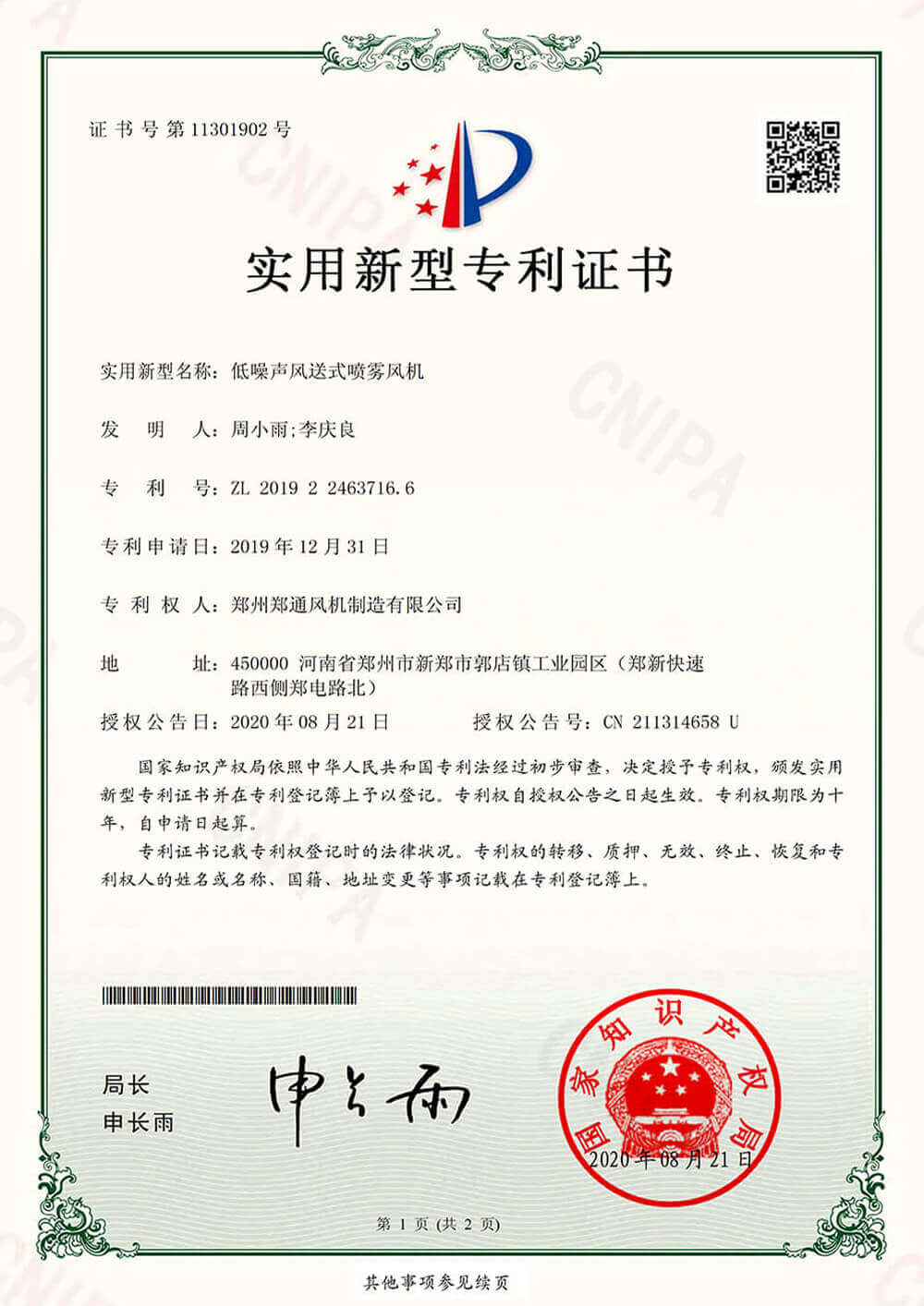 實用新型專利證書1低噪聲風(fēng)送式噴霧風(fēng)機實用新型專利證書